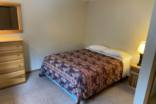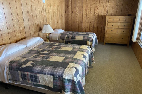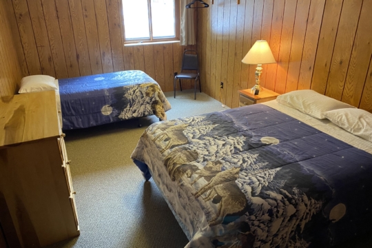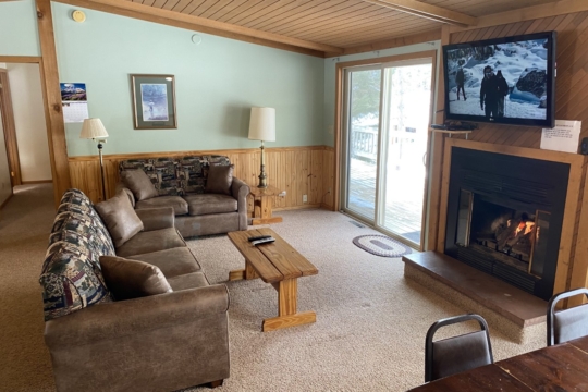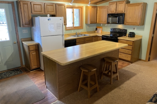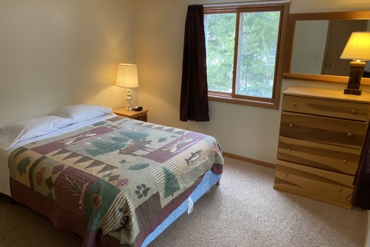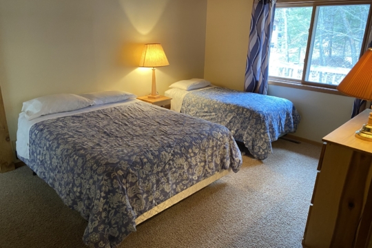 A spacious 5 bedroom nonsmoking bi-level cabin located approximately 300′ from the lake. Main floor has 3 bedrooms, 2 bathrooms – one with a shower & the other with a tub/shower, kitchen w/dishwasher, dining room and living room w/gas fireplace. Has large deck overlooking woods with a lake view. Walk-out level has 2 bedrooms, bathroom w/shower, washer/dryer and a living room. Cabin has forced air gas heat and AC. Has 5 queen beds and 3 twin beds. Maximum number of guests is 15.