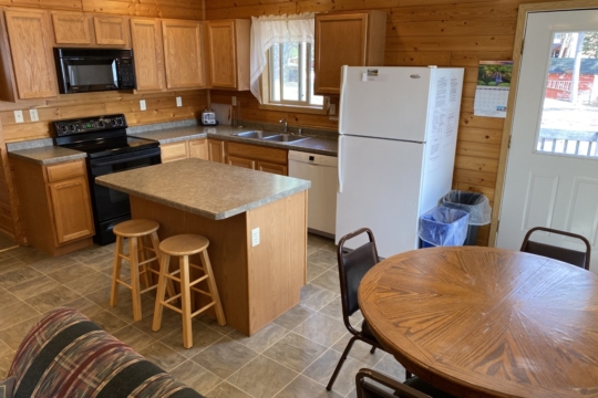 This spacious 2-bedroom non-smoking cabin is located on the lakefront, just 110 ft. from the lake and has a lake view. It has 2-bathrooms, washer/dryer, gas fireplace, kitchen with dishwasher and deck. This cabin has forced air gas heat and air conditioning. Has 2 queen beds and 1 twin bed. Maximum number of guests is 6.