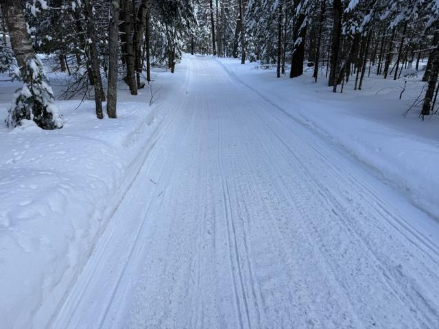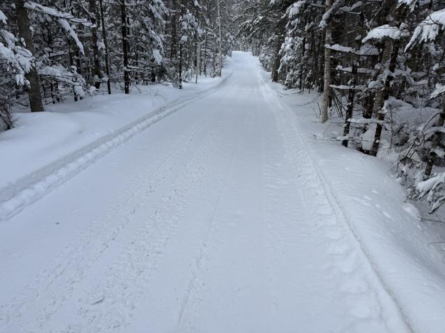 Plowed road trails range from having a good ice base to areas of bare pavement. Carbides will scrape in areas.
