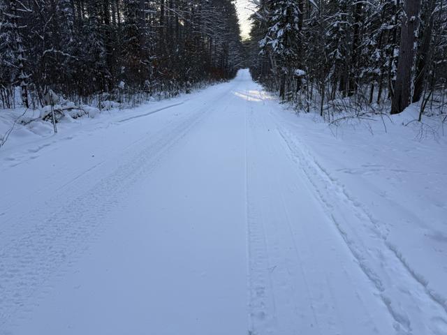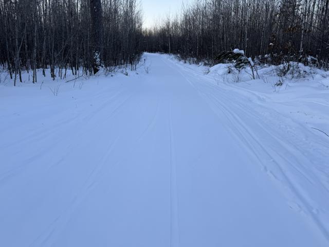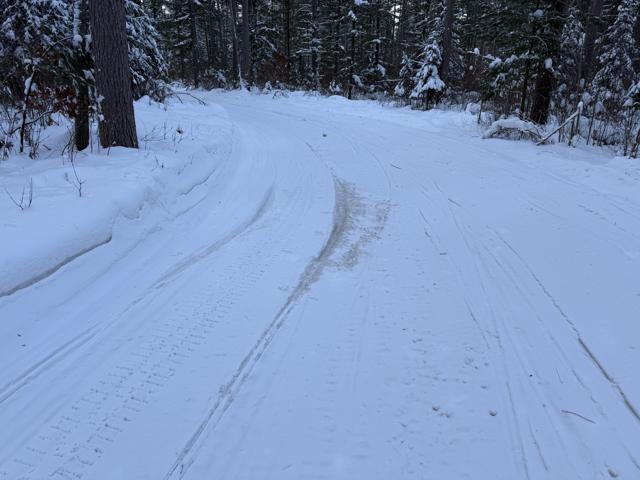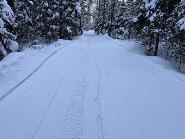 We picked up a little more snow last night so from Thursday night to this morning, we got about 6.5 inches of snow. I headed out for a ride hitting some Sayner, Lake Tomahawk, Eagle River and St. Germain trails. The St. Germain, Eagle River and Lake Tomahawk trails I rode had been groomed. The Sayner trails I rode hadn’t been groomed. The groomed ones were smooth overall but still had some bumps the groomer didn’t flatten out completely. With cold temps, they were packed in tight. The ungroomed ones ranged from fairly smooth with some small bumps to really bumpy and awful. There was some beautiful trails that made me want to ride all day. Others were so bumpy I couldn’t wait to get off them. The carbides did scrape on more corners corners on both the groomed and ungroomed trails. Some trails are brown from snirt while others are mostly to all white. Most plowed road trails have a decent base but some are starting to have areas where the carbides will scrape and there are a few bare spots.