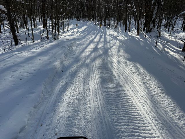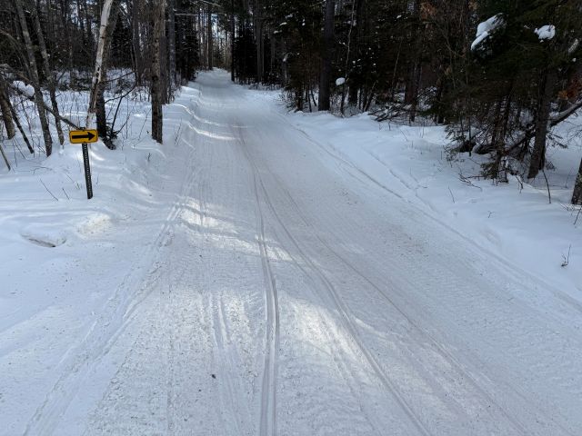 Temps finally ventured above zero so headed out for a ride to see how trails are. I hit some St. Germain and Sugar Camp trails. With the extremely cold temps, grooming appears to have been limited. It looked like St. Germain hasn’t groomed for 2-3 days while the Sugar Camp trail I rode seemed to have been groomed in the last day or two. St. Germain trails ranged from smooth to getting some bumps. I also noticed all traffic rides down the middle of the trail and on some stretches, actually created a deep track. In some cases, this track was as much as a foot lower than the sides of the trail. It would be nice if riders spread out, or better yet ride on their side. The Sugar Camp trails I rode were smooth and nice. My carbides were scraping more today – not just on the insides of some corners, but at times in the groove created by middle riders. Most trails I rode were pretty white but there were some snirty sections.