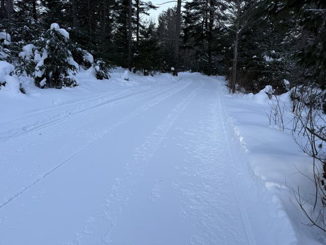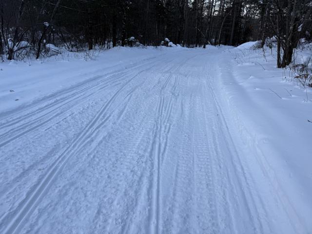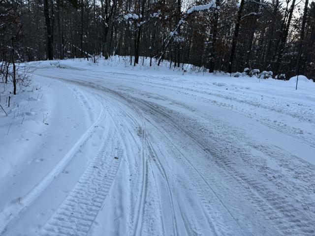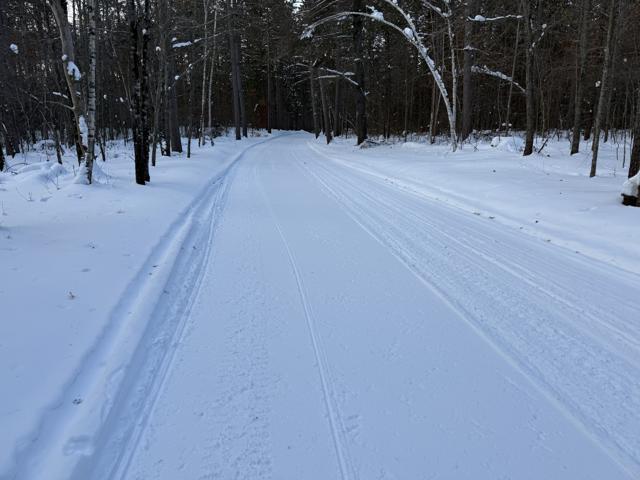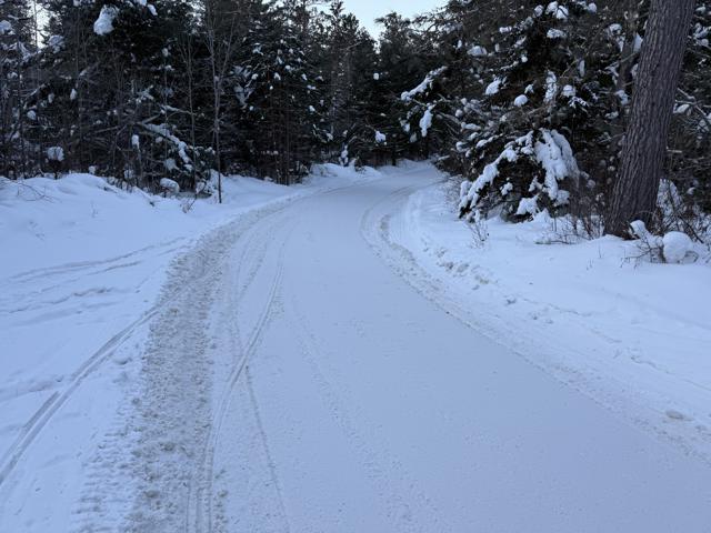 I headed out for a ride hitting some Sayner, Eagle River, Lake Tomahawk and St. Germain trails. The St. Germain trails I rode had been groomed. Sayner and Lake Tomahawk had groomed some of their trails but not others. The Eagle River trails I rode hadn’t been groomed. The groomed ones were smooth overall but still had some bumps the groomer didn’t flatten out completely. With cold temps, they were packed in tight and fun to ride. The Eagle River and Lake Tomahawk ungroomed ones were still pretty smooth. The Sayner ungroomed ones ranged from fairly smooth to bumpy. The carbides did scrape on some corners on both the groomed and ungroomed trails. Some trails are brown from snirt while others are mostly to all white. I’d rate trails from fair (although a grooming will elevate these to good) to excellent. Plowed road trails range from having a decent base with little scraping to areas that are getting thin with the carbides scraping quite a bit.
