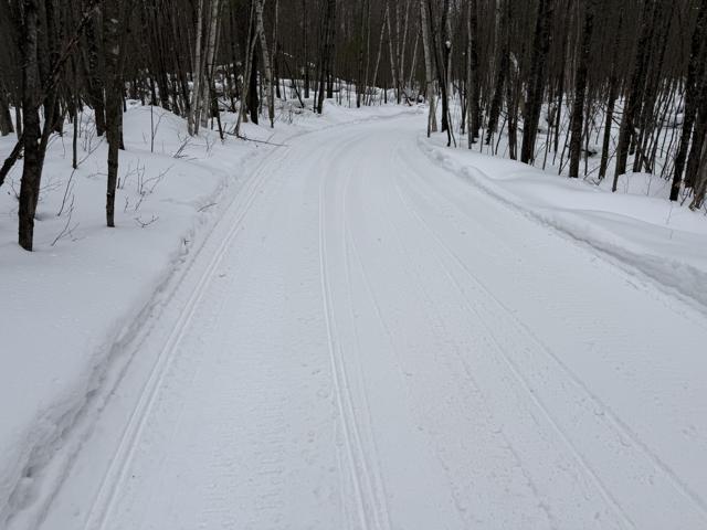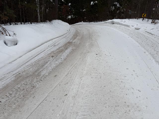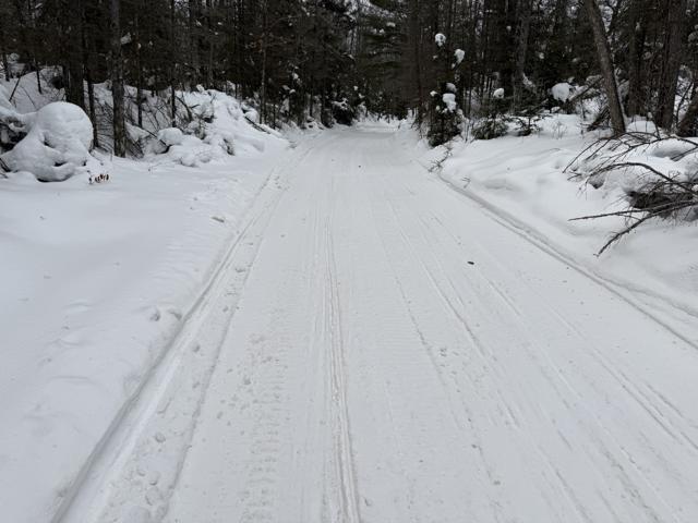 Plowed road trails range from having a decent base with little scraping to areas that are getting thin with the carbides scraping quite a bit. They are also getting some bare areas.