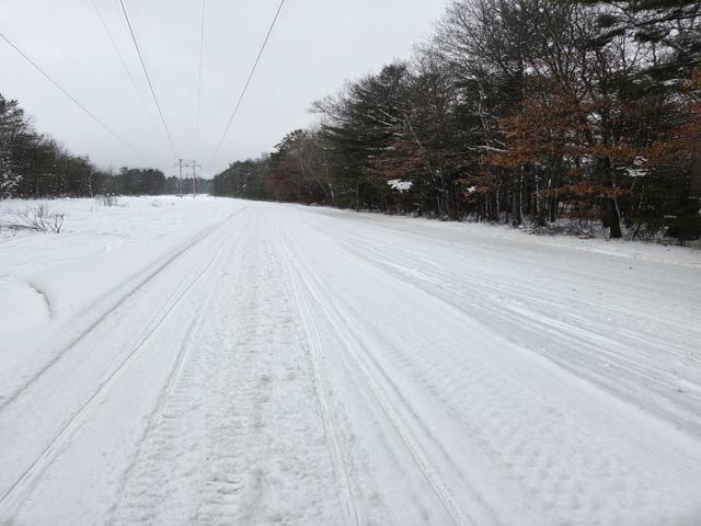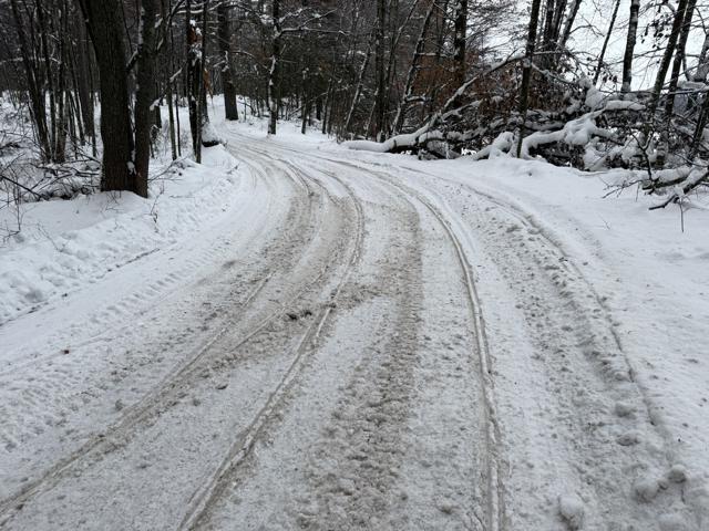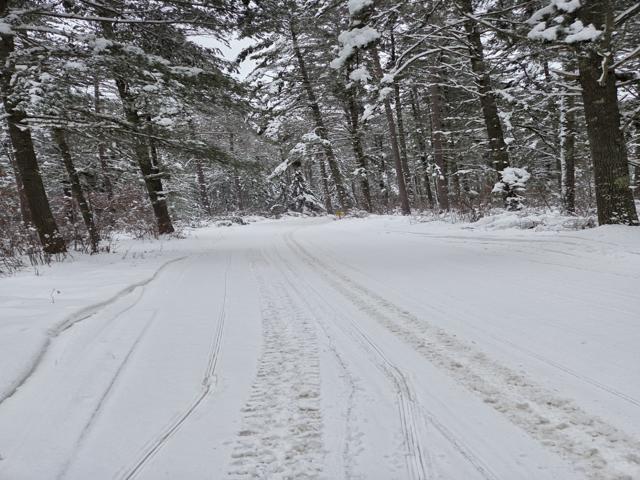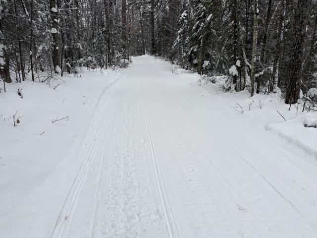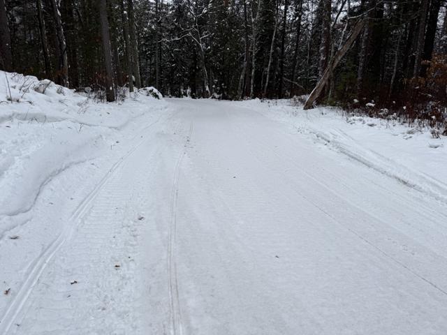 We did get around half inch of heavy wet snow last night. It started snowing this morning but that has changed to drizzle. I headed out for a ride hitting some Sayner, Eagle River, Lake Tomahawk and St. Germain trails. The Sayner and St. Germain trails I rode had been groomed. Lake Tomahawk had groomed some their trails but not others. The Eagle River trails I rode hadn’t been groomed. The groomed ones were smooth overall but still had some bumps the groomer didn’t flatten out completely. The ungroomed ones were pretty smooth overall and looked like they had been groomed the day before but did have some small bumps. I’m going with an overall good rating. Found some that were white, smooth and really nice. Others had corners that are getting pushed out and thin on snow or icy. The carbides were scraping on some corners. Some trails are brown from snirt while others are mostly to all white. Most plowed road trails have a decent base but some are starting to have areas where the carbides will scrape and there are a few bare spots.