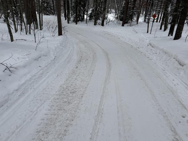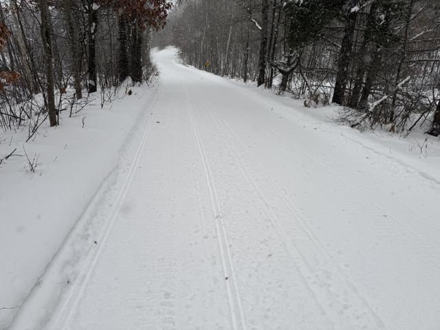 We picked up a dusting of snow this morning. I headed out for a ride hitting some Lake Tomahawk and St. Germain trails. Everything I rode had been recently groomed. They were mostly smooth but had some areas where the groomer didn’t flatten out the bumps completely. With cold temps, they were packed in tight. I was having a blast and didn’t want to stop riding. What I rode was all good to excellent. The carbides did scrape on some corners which was my only complaint. Some trails are brownish from snirt while others are mostly to all white. Most plowed road trails have a decent base but some are starting to have areas where the carbides will scrape and there are a few bare spots.